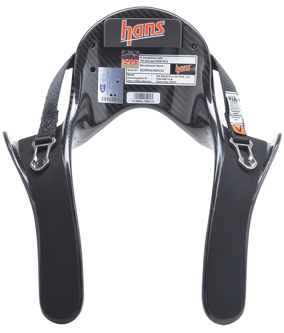 The HANS Pro Ultra Lite is SFI 38.1 and FIA approved. The Pro Ultra device applies aerospace grade carbon to achieve a 100+ gram weight saving compared to the regular Ultra. The Ultra Lite saves on weight and allows for easy entry and exit from the race car, even smaller tighter vehicles. The 100% carbon fiber construction features a hollow core for increased weight reduction without sacrificing strength. The sliding tethers offer exceptional visibility. Each HANS Device is sold complete with two anchors (enough for one helmet) and matching tether. This is the post anchor version in size medium and with a 20 degree angle.