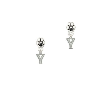 Silver Tone Small Crystal Initial - Y - Beaded Border - Black Crystal Paw Earrings. Silver Tone Small Crystal Initial - Y - Beaded Border is approximately 0.37 x 0.33 x 0.1 inches (HxWxD) not including loop. Paw Earring is approx. 0.34 x 0.30 x 0.08 inches (HxWxD) not including dangle. Earrings have steel posts. Earring backs are Bullet ''Clutch'' Style with Plastic Pad. Earring crystal colors available: Red, Yellow, Green, Blue, Purple, Light Pink, Black, and Clear. Great for sports teams! Lovely gift for dog and cat lovers. PLEASE NOTE: Our products are lead safe, but are not intended for children 14 years and younger.