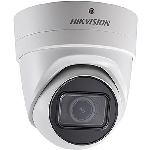The DS-2CD2H45FWD-IZS 4MP IR Outdoor Network Turret Camera from Hikvision uses a 1/2.5" progressive scan CMOS sensor to capture 2688 x 1520 resolution video at 30 fps. IR LEDs provide up to 100' of night vision. The camera's 2.8-12mm motorized varifocal lens delivers a 114-32° horizontal field of view. Two-way audio is possible thanks to an audio input and output. An onboard memory card slot accepts microSD/SDHC/SDXC cards up to 128GB (available separately). Integrated PoE technology simplifies connectivity by enabling the transfer of power and data through a single cable. This turret camera is compliant with ONVIF profiles S and G, making it compatible with a wide range of surveillance devices. The camera's metal enclosure is IP67 and IK10 rated for outdoor use in areas at risk of vandalism.