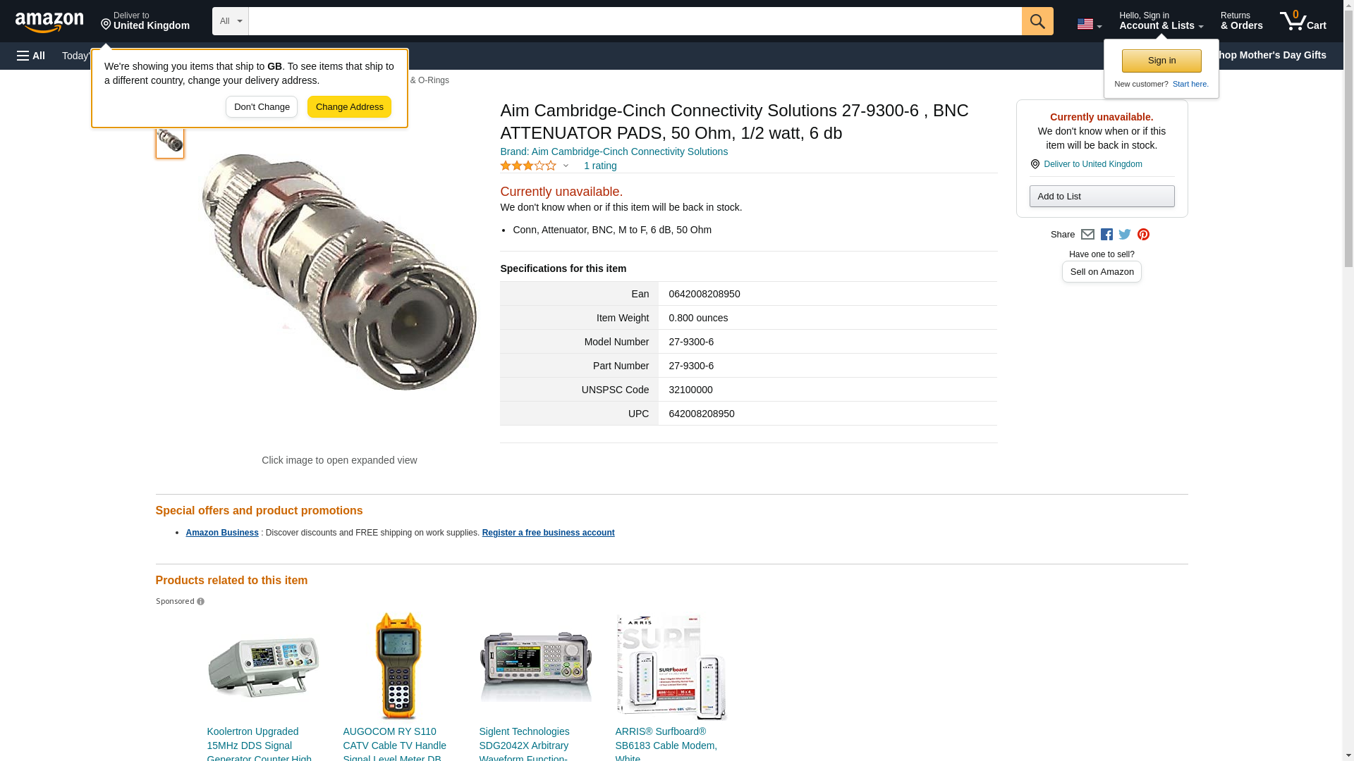 Aim Cambridge-Cinch Connectivity Solutions 27-9300-6 , BNC ATTENUATOR PADS, 50 Ohm, 1/2 watt, 6 db