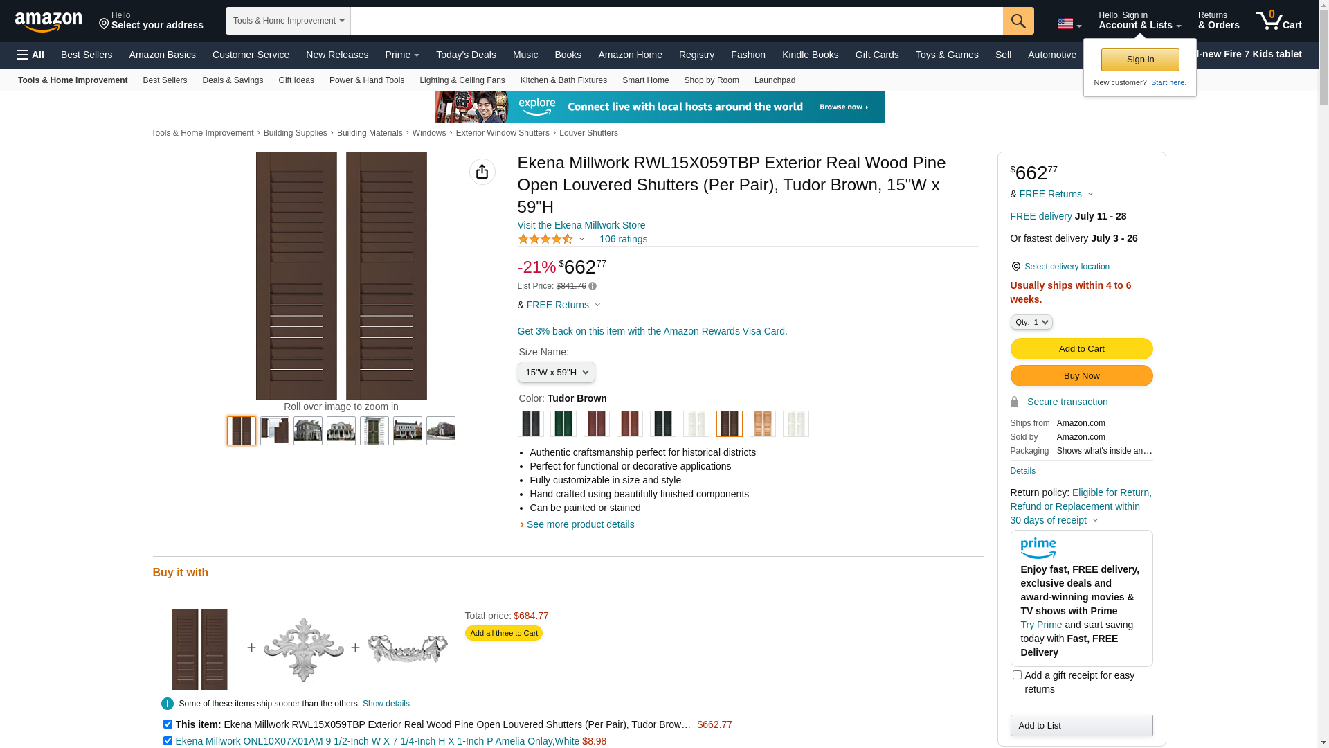 Ekena Millwork RWL15X059TBP Exterior Real Wood Pine Open Louvered Shutters (Per Pair), Tudor Brown, 15"W x 59"H