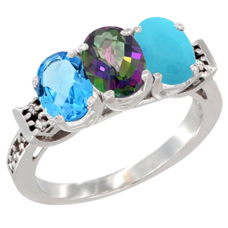 14K White Gold Natural Swiss Blue Topaz, Mystic Topaz & Turquoise Ring 3-Stone 7x5 mm Oval Diamond Accent, sizes 5 - 10