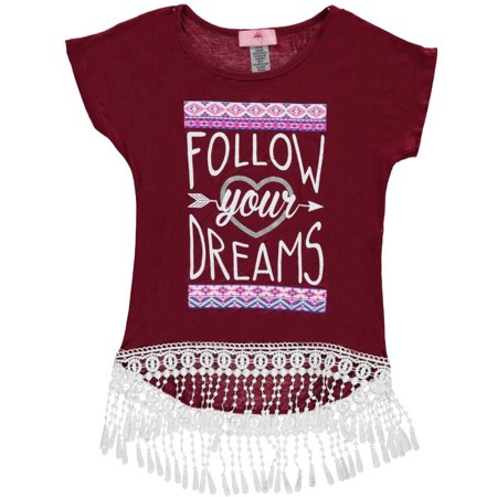Dream Girl adds a hi-low hem with delicate crochet trim to this fashionable top! <ul> <li>Dream Girl top</li> <li>Rayon-blend jersey construction</li> <li>Glittery chest graphic</li> <li>Hi-low hem with crochet trim</li> <li>95% rayon, 5% spandex</li> <li>Machine wash cold</li> <li>Imported</li> </ul>
