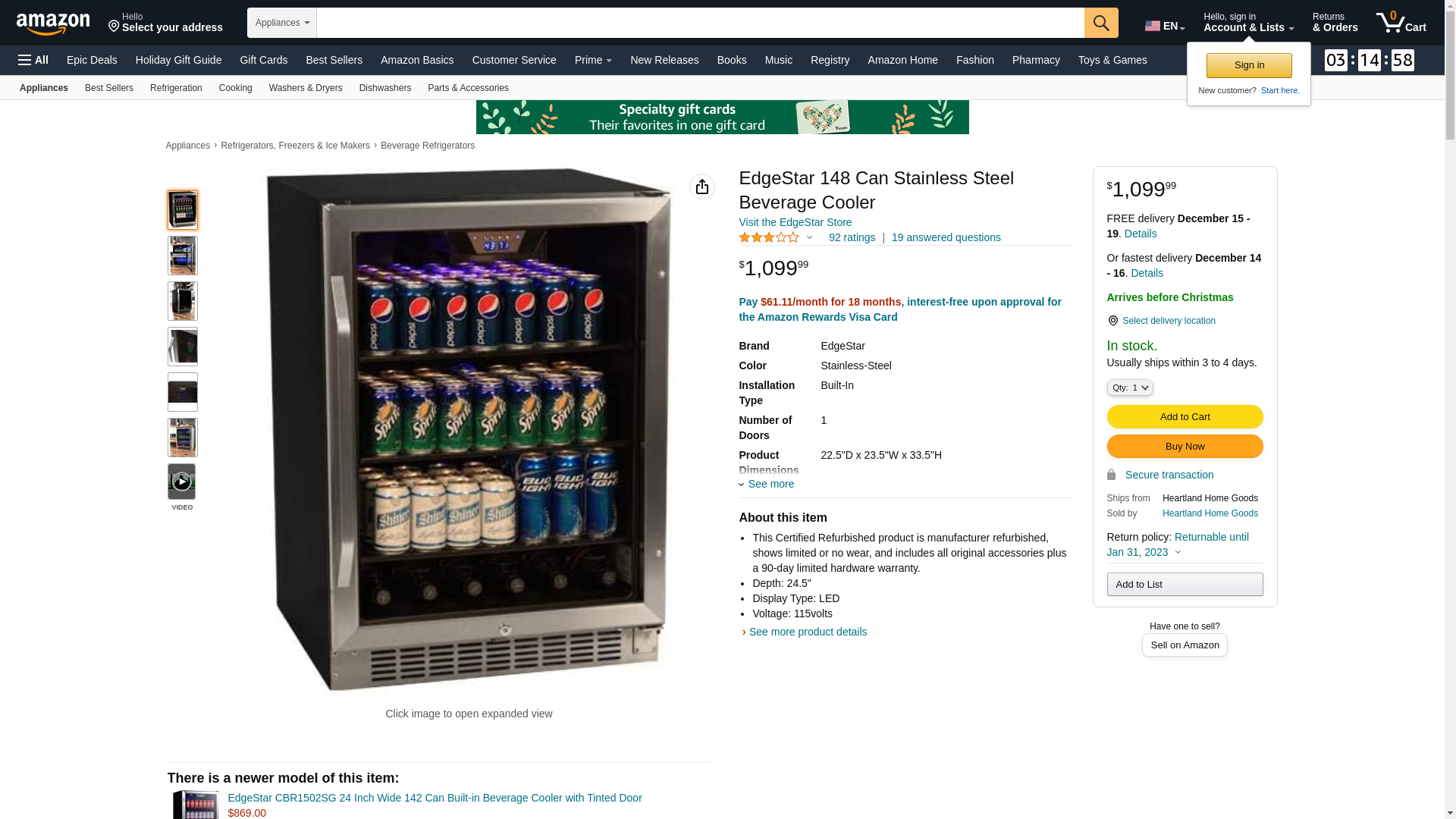Store your beverages in the EdgeStar 148 Can Stainless Steel Beverage Cooler (CBR1501SG) to keep them cool and ready to drink. This cooler with a stainless steel finish allows you to store up to 148 standard 12 oz. cans, which is great if you decide to entertain guests or throw a party and you need to keep all your refreshments cold. Ideal for kitchens, game rooms, garages and more, this beverage refrigerator will keep your drinks cold for you and your friends. Capacity: The included glass shelves help neatly store up to 148 12 oz. cans and feature holes for improved circulation of cold air Fan Cooled: For more even cooling, the air in the CBR1501SG is fan circulated which is more effective than cold plate cooling that tends to create a cold spot in the unit Interior Lighting: A manual light illuminates the beverage selection, making it easier to find the right drink 24 Width:The cooler's 24 width fits perfectly into mid-sized undercounter spaces Tinted Glass: The black dotted door tint prevents UV rays from infiltrating the cooler so your beverages will stay protected