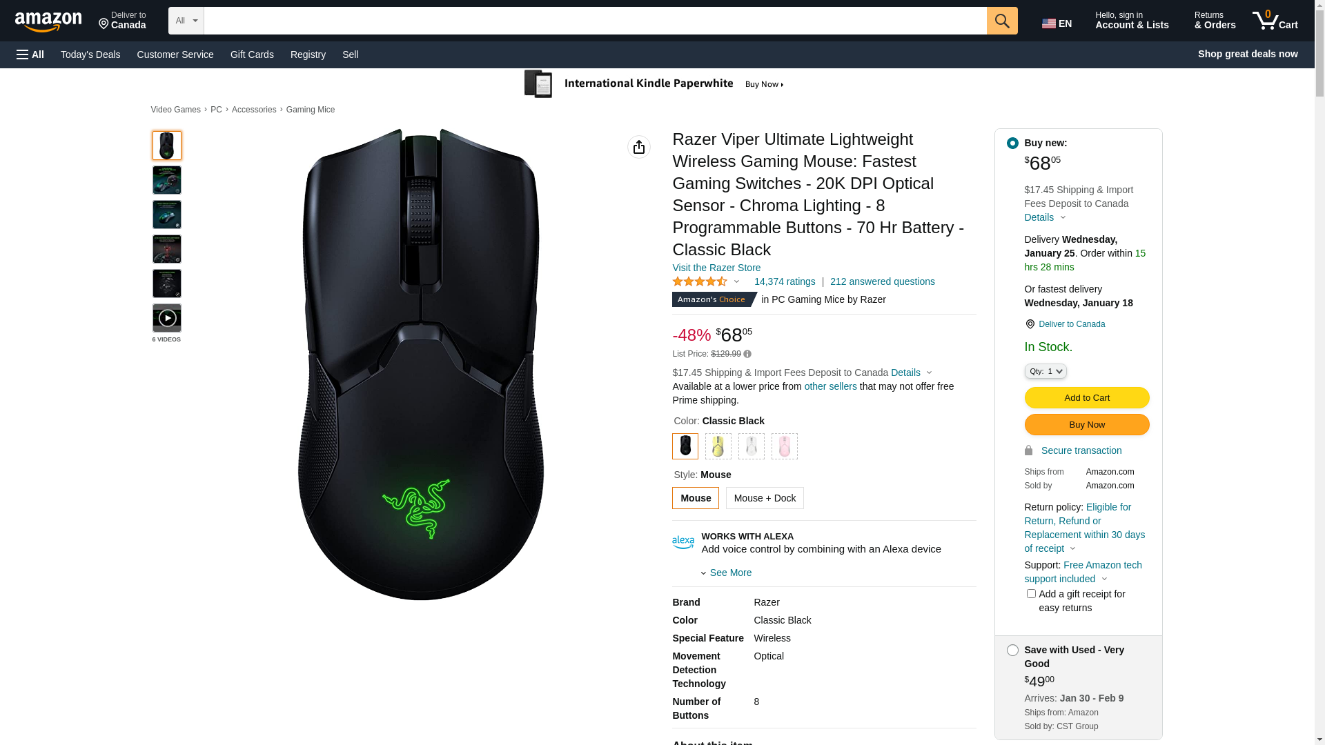 NOT ALL WIRELESS MICE ARE MADE EQUAL Forget about average and claim the unfair advantage with the Razer Viper Ultimate—a wireless gaming mouse built to win. Designed to be a true extension of a gamer, this deadly predator comes with our most cutting-edge technology, and is ready to sink its fangs into the competition. UP YOUR STAY-HOME GAME Take care of yourself, your work and your opponents with our curated list of Razer gear. RAZER HYPERSPEED WIRELESS 25% faster than any other wireless technology available, you won’t even realize that you’re gaming with a wireless mouse due to its high-speed transmission, lowest click latency, and seamless frequency switching in the noisiest, data-saturated environments. Our new, improved sensor has an industry-leading 20,000 DPI with 99.6% resolution accuracy, ensuring that even the finest movement from this wireless mouse is tracked with consistency. Equipped with intelligent functions, the sensor becomes even more accurate, allowing for an acute level of precision for game-winning headshots. RAZER OPTICAL MOUSE SWITCH Utilizing an infrared light beam to register every click, the switches in this wireless mouse actuate with an industry-leading response time of 0.2 milliseconds. Because it no longer requires traditional physical contact, this form of actuation removes the need for debounce delay and never triggers unintended clicks, giving you closer control and flawless execution. 70 HOURS OF BATTERY LIFE 5 ON-BOARD MEMORY PROFILES 8 PROGRAMMABLE BUTTONS. Charging Dock not included. Included in Box: Razer Viper Ultimate Wireless Gaming Mouse (Mouse Only) Certified Refurbished, Mouse