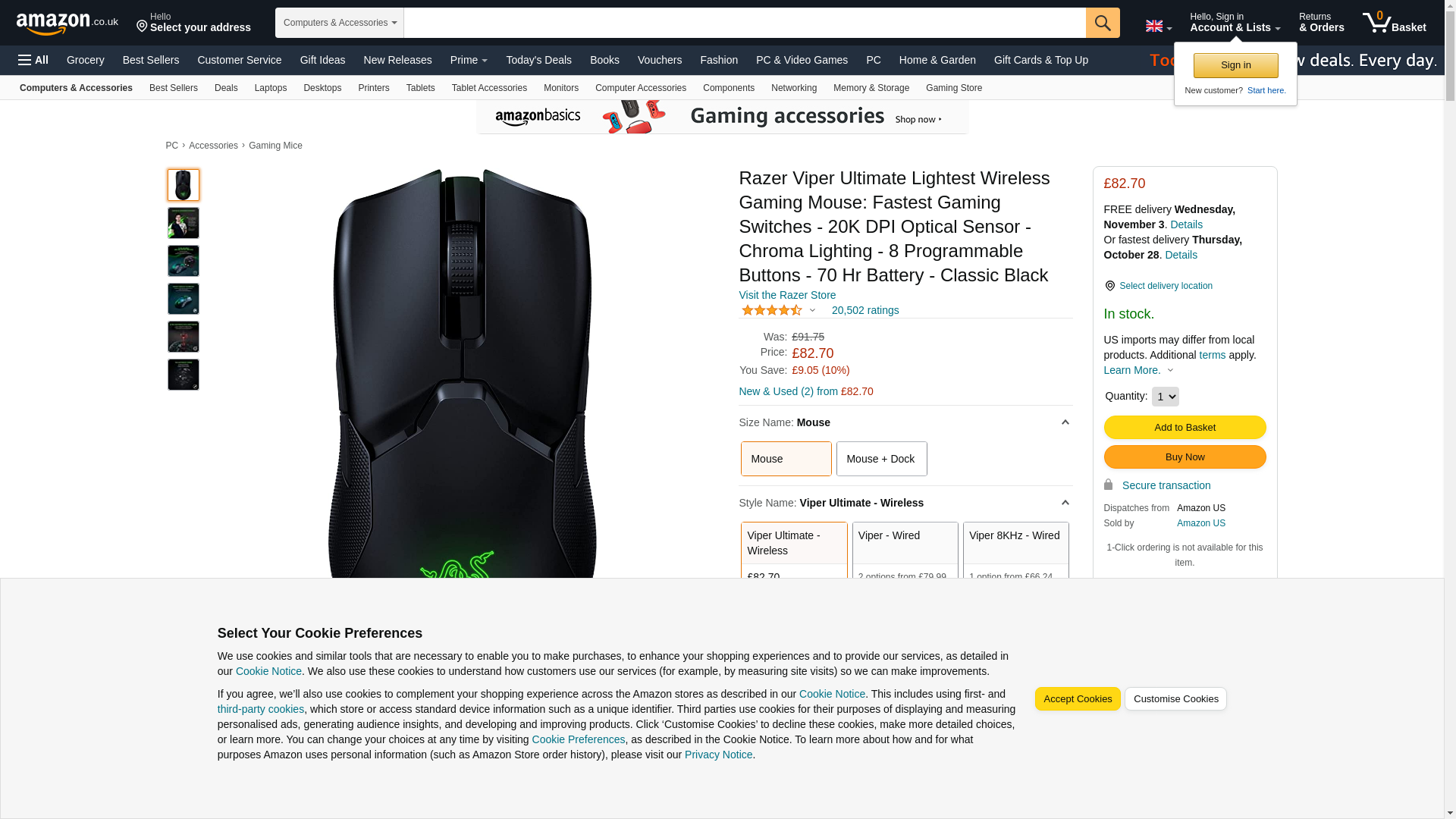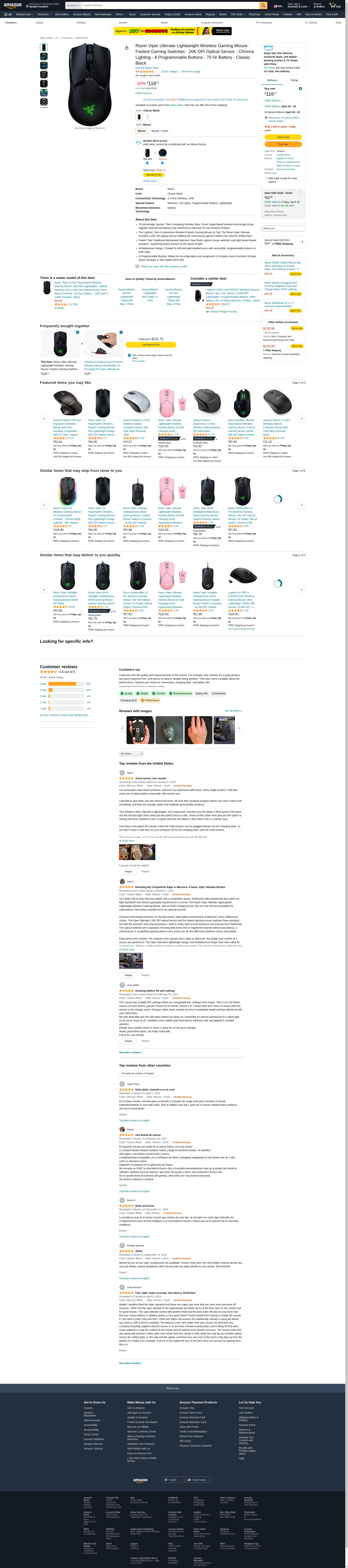 Razer Viper Ultimate Lightweight Wireless Gaming Mouse: Fastest Gaming Switches - 20K DPI Optical Sensor - Chroma Lighting - 8 Programmable Buttons - 70 Hr Battery - Classic Black