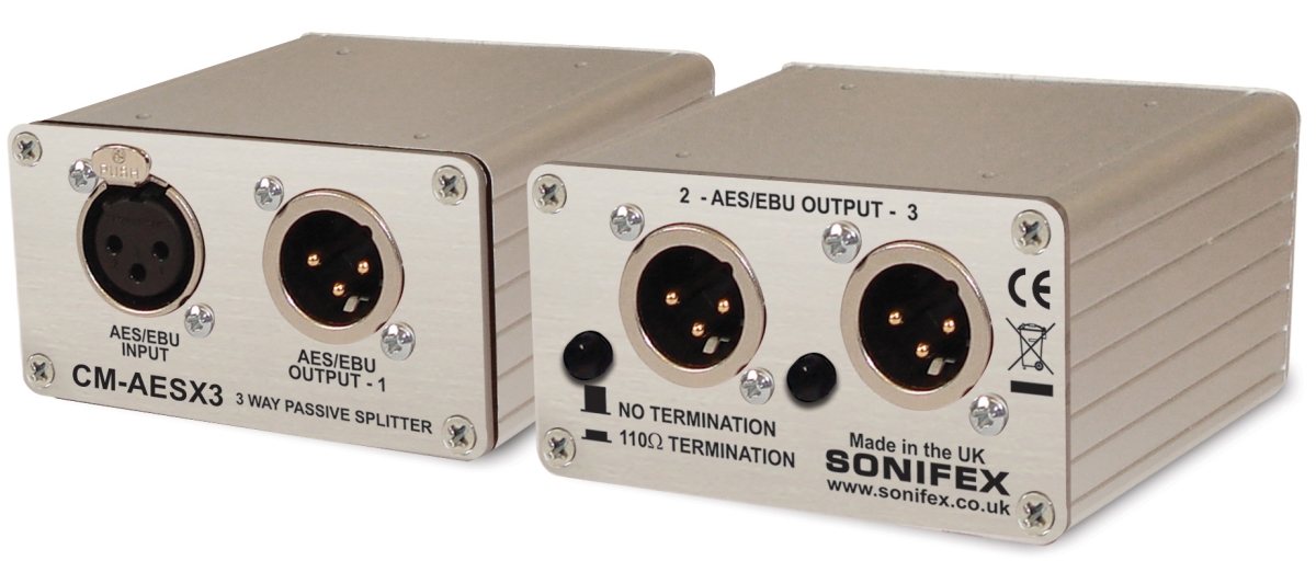 The Sonifex Ltd. <b>CM-AESX3</b> is a passive "one-to-three" splitter housed in a small but robust aluminum box. It is designed to split a single AES3 digital audio source to up to three destinations, using Neutrik XLR connectors. The CM-AESX3 provides solutions to a range of digital signal distribution problems, where correct termination is essential to maintain signal integrity. The input signal is split through high quality transformers, and 110Ω termination can be applied, if desired, to unconnected outputs.</p><p>The CM-AESX3 requires no power to operate, ensuring your audio remains connected from source to destination(s) without interruption from power failures.</p>