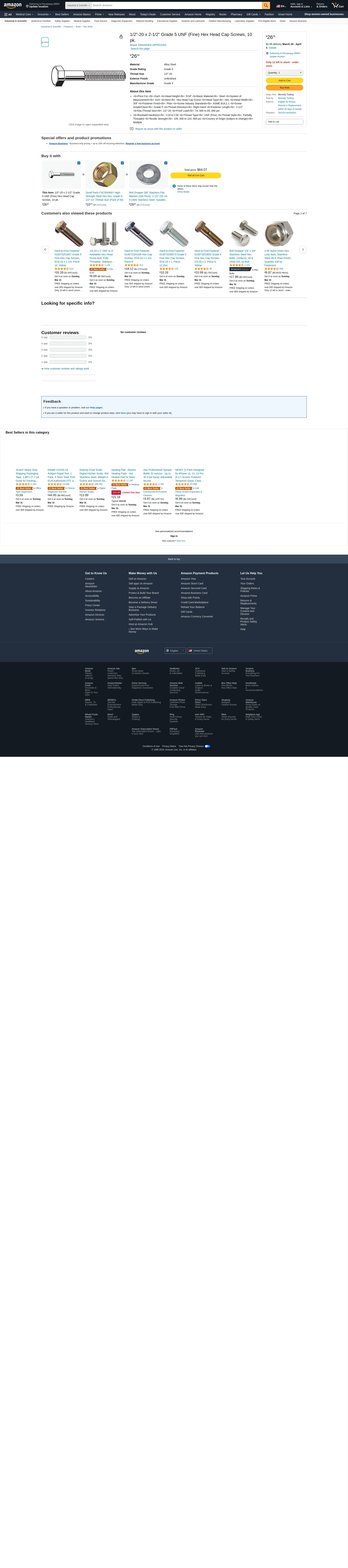 | Feature | <b>Price For:</b> Each <b>Head Height</b>: 5/16" <b>Basic Material</b>: Steel <b>System of Measurement</b>: Inch <b>Item</b>: Hex Head Cap Screw <b>Head Type</b>: Hex <b>Head Width</b>: 3/4" <b>Fastener Finish</b>: Plain <b>Screw Industry Standards</b>: ASME B18.2.1 <b>Screw Grade/Class</b>: Grade 5 <b>Thread Direction</b>: Right Hand <b>Fastener Length</b>: 2-1/2" <b>Dia./Thread Size</b>: 1/2"-20 <b>Proof Load</b>: 74, 000 to 85, 000 psi |