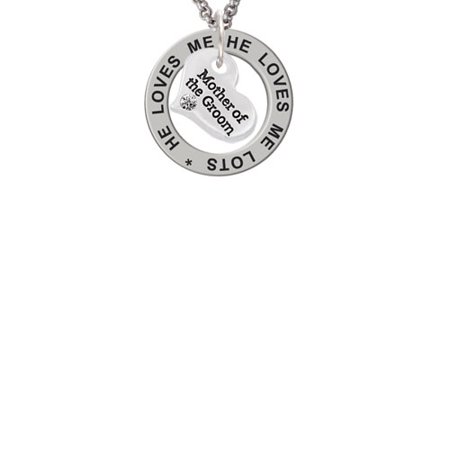 Silver Tone Small Mother of the Groom Heart He Loves Me Affirmation Ring Necklace. Small Mother of the Groom Heart is approximately 0.57 x 0.53 x 0.12 inches (HxWxD) with clear crystal. Small antiqued flower on the back inches (HxWxD). Available as Bride, Bridesmaid, Maid of Honor, Matron of Honor, Mother of the Bride, and Mother of the Groom. Silver tone 2mm Belcher Chain Necklace is approx. 23 Inches with a Lobster Claw Clasp. Affirmation Ring is approx. 0.86 x 0.86 x 0.05 (HxWxD). This inspirational piece of jewelry is very meaningful. Its circular shape is symbolic for endless belief in the message that is imprinted around the ring. These are motivational or sentimental messages to the wearer. Perfect gift for that strong and determined woman in your life. Show her how much you believe in her! PLEASE NOTE: Our products are lead safe, but are not intended for children 14 years and younger.