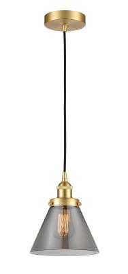INNOVATIONS 616-1PH-SG-G43-LED 1-Light Mini Pendant Satin Gold. Collection: Edison. Style: Industrial, Farmhouse, Restoration-Vintage, Transitional. Metal Finish: Satin Gold. Metal Finish (Canopy/Backplate): Satin Gold. Material: Steel, Cast Brass, Glass. Dimension(in): 10(H) x 8(W) x 8(Dia). Min/Max Height (Fixture Height with Cord or Included Stems & Canopy)(in): 13.25/131.25. Wire/Cord: 10 Feet Of Black Fabric Cord. Bulb: (1)6W Medium Base,Dimmable(Not Included). Maximum Wattage Per Socket: 100. Voltage: 120. Color Temperature (Kelvin): 2700. CRI: 82. Lumens: 600. Glass Shade Description: Plated Smoke Large Cone. Glass or Metal Shade Color: Plated Smoke. Shade Material: Glass. Glass Type: Colorful. Shade Shape: Cone. Shade Dimension(in): 7.75(W) x 6(H). Fitter Measurement (Glass Or Metal Shade Fitter Size): 3.25 inch Fitter. Canopy Dimension(in): 4.75(Dia) x 1(H). Sloped Ceiling Compatible: Yes. California Proposition 65 Warning Required: Yes. UL & ETL Certification: Damp Location.