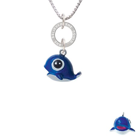 Hand Painted Resin Blue Baby Whale She Believed She Could So She Did Eternity Ring Necklace. Resin Blue Baby Whale is approximately 0.66 x 0.71 x 0.78 inches (HxWxD). Light weight alternative to metal charms. 1.3mm Box Chain Necklace is adjustable from 18 to 20 inches. Necklace comes with lobster claw clasp and 2 inch extender chain. Its circular shape is symbolic for endless belief in the message that is imprinted around the ring. These are motivational or sentimental messages to the wearer. Makes a great gift! Featured necklace is an exclusive Delight & Co. design. We are a family owned company for over 35 years in the U.S.A. PLEASE NOTE: Our products are lead safe, but are not intended for children 14 years and younger.