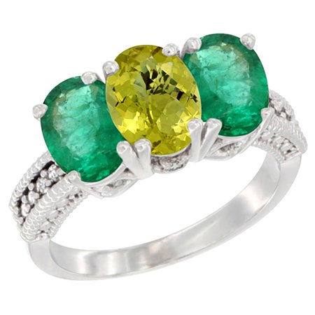10K White Gold Diamond Natural Lemon Quartz & Emerald Ring 3-Stone 7x5 mm Oval, sizes 5 - 10