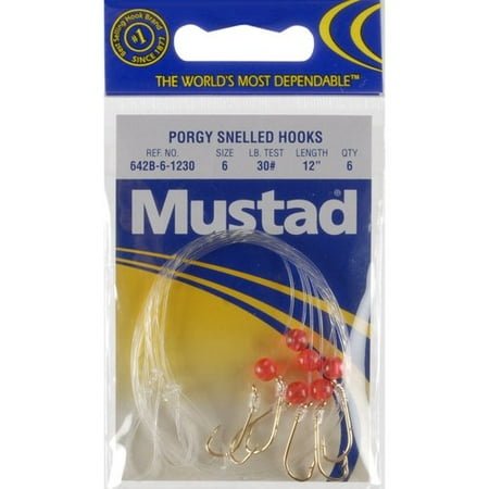 <p><b>Mustad Gold Porgy Snell Hooks, 6pk:</b></p> <ul> <li>Fluorescent beads</li> <li>12" leader</li> <li>30-lb test</li> </ul>
