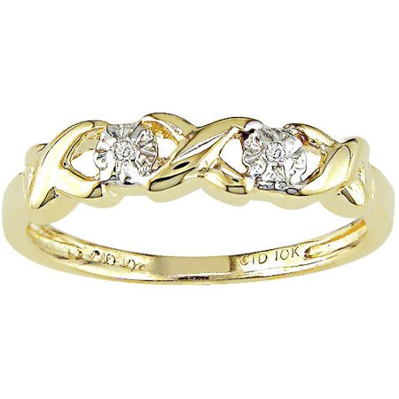 <br />This elegant yellow gold ring glows with the radiance of diamonds. <br /> <br />Crafted in 10-karat yellow gold, the ring features two round bead-set diamonds (0.01 total carat weight, J-K color, I2-I3 clarity). Each diamond is set between three 'x' motifs, adding a modern touch to this classic design. <br /> <br />Shop Overstock.com for a huge selection of fine jewelry at our low online prices every day. <br /> <br /> <b><i>All carat weights and measurements are approximate and may vary slightly from the listed information.*T.W. (total weight) may vary and is a minimum of .010 carats.Treatment code N. See <a href="https://www.overstock.com/cgi-bin/d2.cgi?PAGE=staticpage&page_id=2200"> <span class="links"> Gemstone Treatments</span></a> for further information.</i></b> <br /> <br /> <a href="https://www.overstock.com/downloads/pdf/2010_RingSizing.pdf" target="new"><span class="links">Click here for Ring Sizing Chart</span></a>