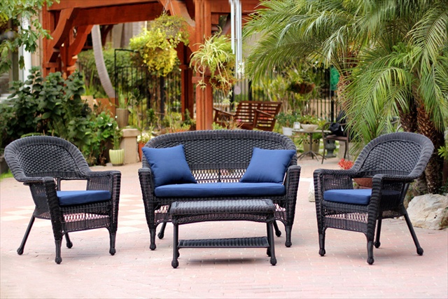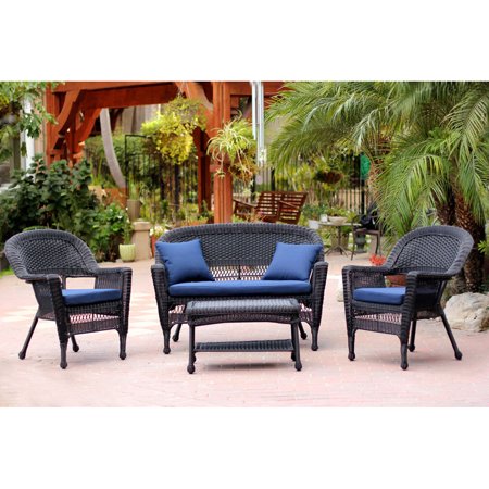 Jeco 4pc Wicker Conversation Set in Black with Navy Blue Cushions