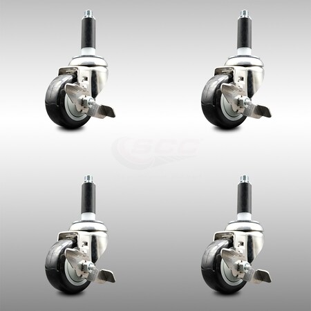 Service Caster Brand 3 Inch 316 Stainless Steel Light Duty Swivel Expanding Stem Caster Set of 4 Black Polyurethane Caster Wheels and 3/4” Stem–1,200lbs. Total Cpty–Casters with Locking Brakes