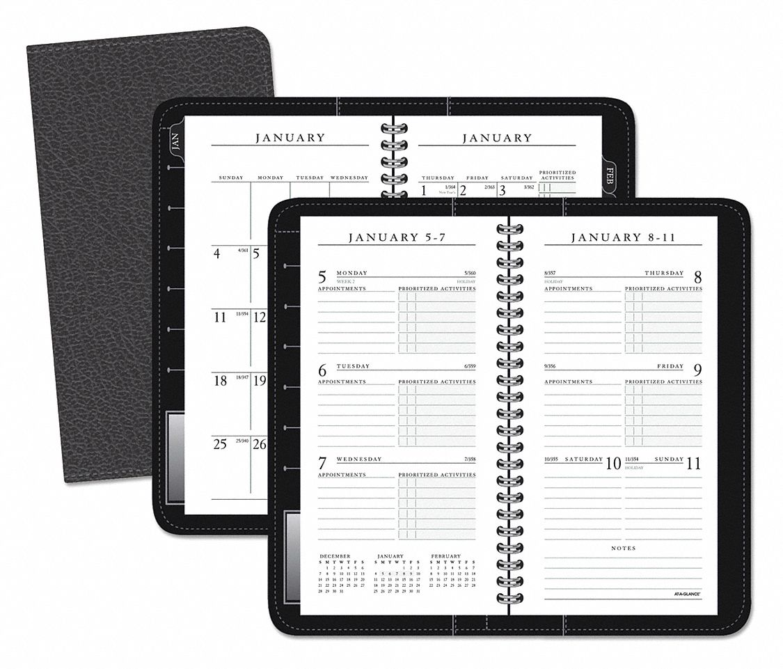 - Open scheduling; past, current and future months reference; Julian dates; removable telephone and address book