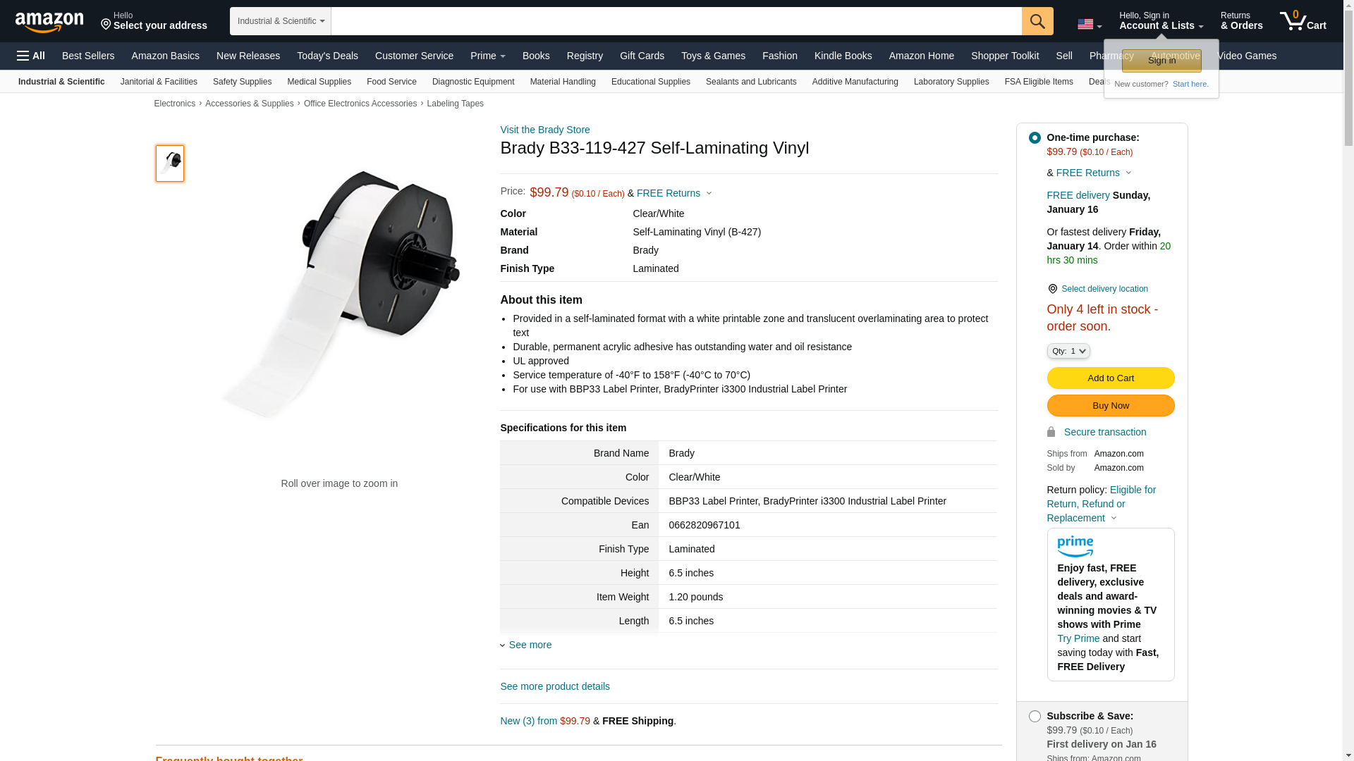 <p><strong>Brady, B33-119-427, 142870 BBP33 1.5" x 1.5" Clear with White Printable Zone Vinyl Labels</strong></p><p>Self-Laminating Vinyl (B-427) is an excellent material for wire and cable identification. This material has good clarity, conformability and is self-extinguishing.</p><p><strong>Features:</strong></p><ul> <li>Provided in a self-laminated format with a white printable zone and translucent overlaminating area to protect text</li> <li>Durable, permanent acrylic adhesive has outstanding water and oil resistance</li> <li>UL approved</li> <li>Service temperature of -40°F to 158°F (-40°C to 70°C)</li></ul>