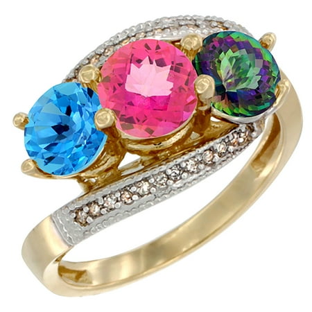 14K Yellow Gold Natural Swiss Blue Topaz, Pink & Mystic Topaz 3 stone Ring Round 6mm Diamond Accent, sizes 5 - 10