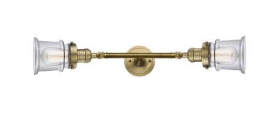 INNOVATIONS LIGHTING 208L-BB-G182S Small Canton 2 Light Bath Vanity Light part of the Franklin Restoration Collection. The Small Canton 2 Light Bath Vanity Light is part of the Franklin Restoration Collection. Solid Brass 180 Degree Adjustable Swivels with internal teeth that lock in at 5 degree intervals. Collection: Franklin Restoration. Material: Steel, Cast Brass, Glass. Metal Finish(Body): Brushed Brass. Metal Finish(Canopy/Backplate): Brushed Brass. Dimension(in): 6(W) x 24.5(H) x 10(Ext). Bulb: (2)100 Medium Base Vintage Bulb recommended(Not Included). Voltage: 120. Glass: Clear Canton/Transparent. Shade Shape: Bell. Shade Material: Glass. Shade Size(in): 5.25 X 5.5. Shade Fitter Measurement: 3.25 inch Fitter. Canopy Dimension(in): 4.5. Backplate Dimension(in): 4.5x0.75. Solid Brass 180 Degree Adjustable Swivels with internal teeth that lock in at 5 degree intervals. Fixtures can be hung Horizontally or Vertically. Fixture can be hung with bulbs facing up or down as a Wall Mount. UL/CUL Damp Rated. Warranty: 2 Year Finish, Lifetime Electrical.