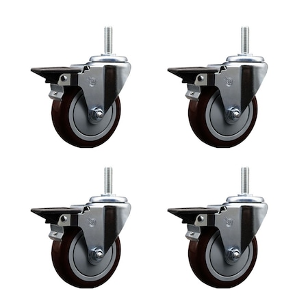 Polyurethane Swivel Threaded Stem Caster Set of 4 w/4" x 1.25" Maroon Wheels and 5/8" Stems - Includes 4 with Posi Lock Brakes - 1400 lbs Total Capacity - Service Caster Brand