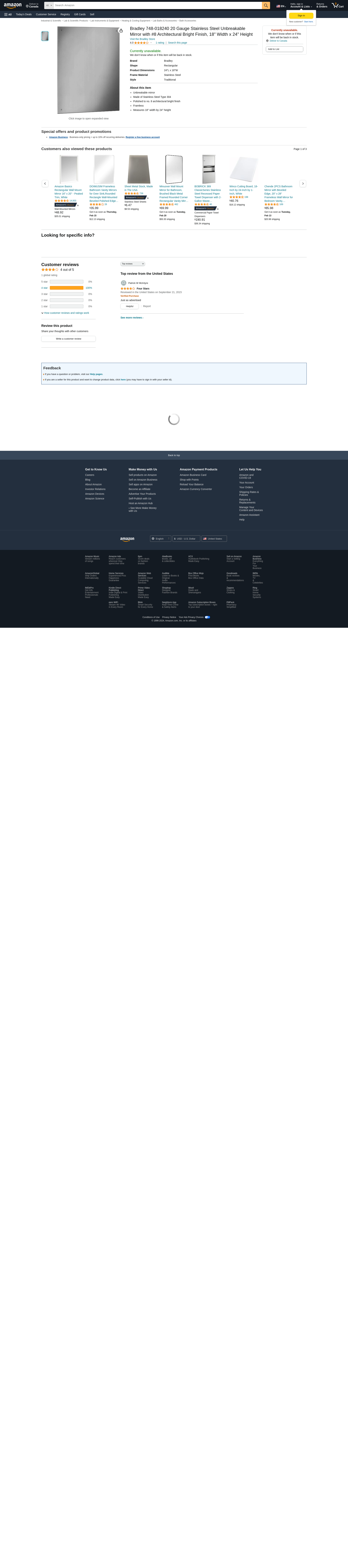 Bradley 748-018240 20 Gauge Stainless Steel Unbreakable Mirror with #8 Architectural Bright Finish, 18" Width x 24" Height