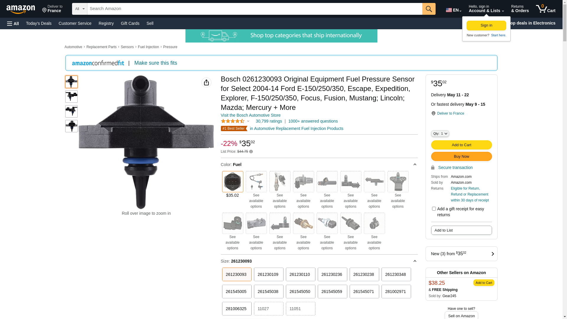 Bosch 0261230093 Original Equipment Fuel Pressure Sensor - Compatible With Select Ford E-150/250/350, Escape, Expedition, Explorer, F-150/250/350, Focus, Fusion, Mustang; Lincoln; Mazda; Mercury +More