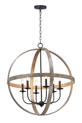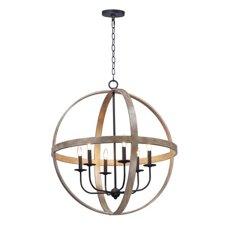 Maxim 27576BWBK Compass Wood-tone Sphere Pendant, 6-Light 360 Total Watts, 33"H x 30"W, Barn Wood/Black