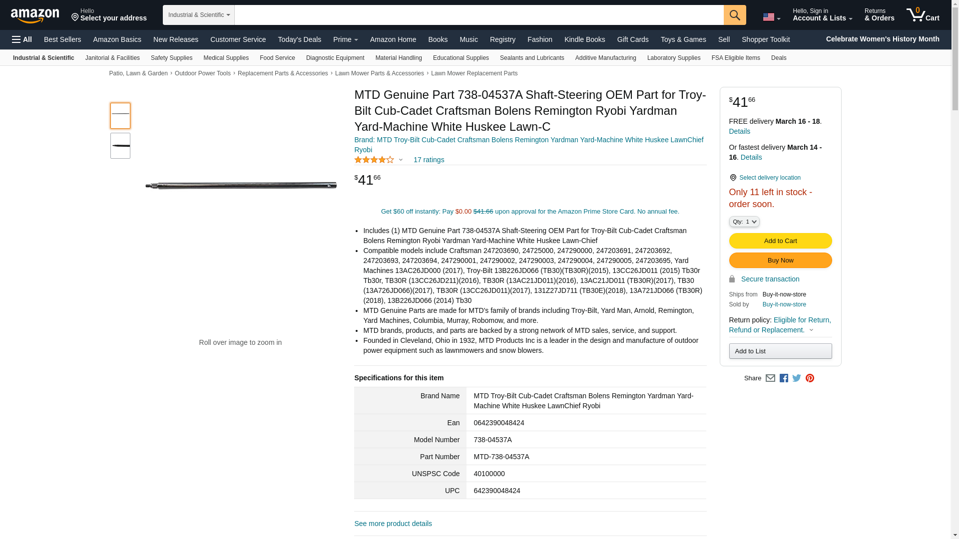 - Includes (1) MTD Genuine Part 738-04537A Shaft-Steering OEM Part for Troy-Bilt Cub-Cadet Craftsman Bolens Remington Ryobi Yardman Yard-Machine White Huskee Lawn-Chief