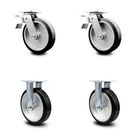 Rubber on Aluminum Swivel Caster w/Main. Free Bearings Set of 4 w/8" x 2" Black Wheels - Includes 2 Swivel with Total Lock Brakes & 2 Rigid - 2400 lbs Total Capacity - Service Caster Brand