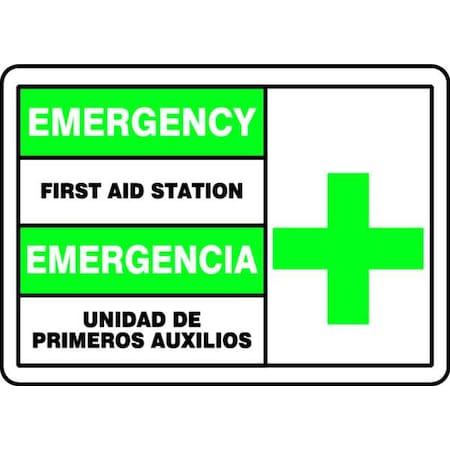 Accuform SBMFSD924VP Sign, Emergency First AID Station/EMERGENCIA UNIDAD DE PRIMEROS AUXILIOS", 10" Length x 14" Width x 0.055" Thickness, Plastic, 10" x 14", Green/Black on White
