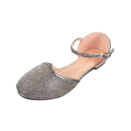 <ul> <li>Angels flats</li> <li>Metallic PU upper</li> <li>Glittery rhinestone accents</li> <li>Ankle strap with hook-and-loop closure</li> <li>Cushioned memory foam insole</li> </ul>
