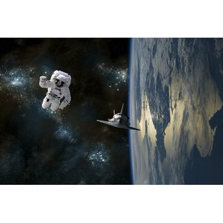 An astronaut drifting in space is rescued by a space shuttle orbiting Earth Poster Print