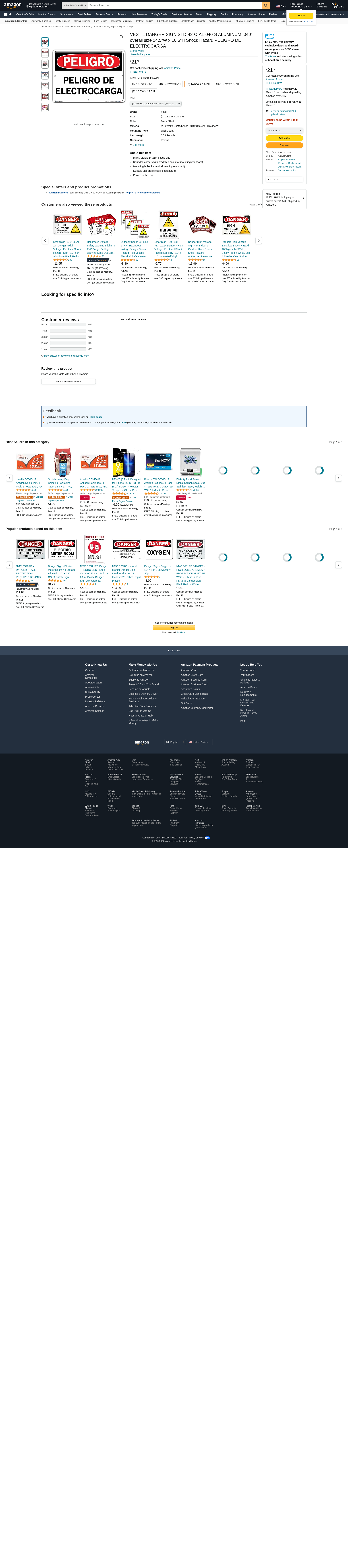 VESTIL DANGER SIGN SI-D-42-C-AL-040-S ALUMINUM .040" overall size 14.5"W x 10.5"H Shock Hazard PELIGRO DE ELECTROCARGA