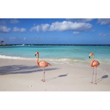 <ul> <li>Title: Flamingos on Flamingo Beach, Renaissance Island, Oranjestad, Aruba, Lesser Antilles</li> <li>Artist: Jane Sweeney</li> <li>Product Type: Photographic Print</li> </ul>