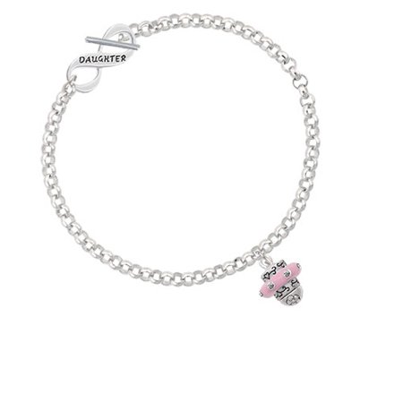 Crystal Pink Spinner Daughter Infinity Toggle Chain Bracelet. Silver Tone, hand enameled charms. Spinner Charm size is approx. 0.66 x 0.55 x 0.55 inches (HxWxD) including loop. 3mm Rolo Chain is 7 inches long. Infinity Toggle is approx. 0.90 x 0.40 x 0.10 inches (HxWxD). The infinity symbol represents the quality of being limitless or endless. Choose your favorite message to represent your love, faith, or commitment that lasts forever. We are a family owned company in the U.S.A. since 1977. PLEASE NOTE: Our products are lead safe, but are not intended for children 14 years and younger.