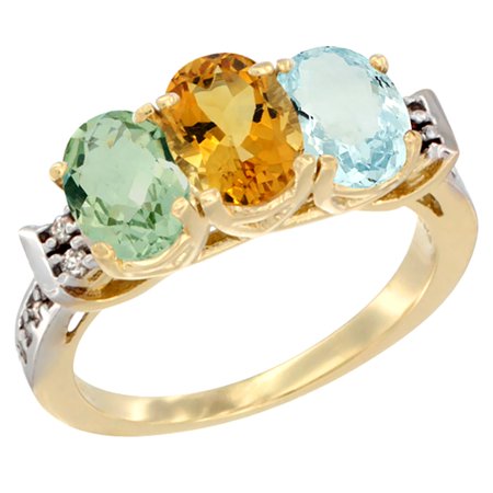 14K Yellow Gold Natural Green Amethyst, Citrine & Aquamarine Ring 3-Stone 7x5 mm Oval Diamond Accent, sizes 5 - 10