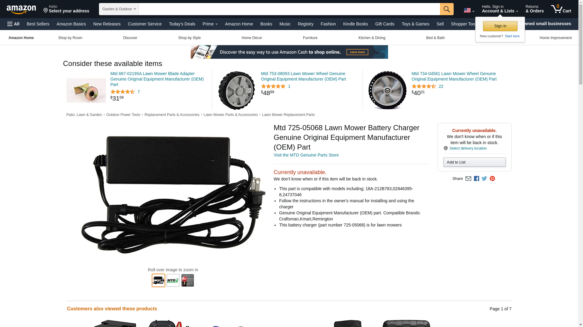 - This battery charger (part number 725-05068) is for lawn mowers