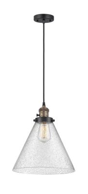 INNOVATIONS 201CSW-BAB-G44-L 1-Light Mini Pendant Black Antique Brass. Collection: Franklin Restoration. Style: Industrial, Farmhouse, Restoration-Vintage, Transitional. Metal Finish: Black Antique Brass. Metal Finish (Canopy/Backplate): Black Antique Brass. Material: Steel, Cast Brass, Glass. Dimension(in): 14(H) x 12(W) x 12(Dia). Min/Max Height (Fixture Height with Cord or Included Stems & Canopy)(in): 17.25/135.25. Wire/Cord: 10 Feet Of Black Textured Cord. Bulb: (1)60W Medium Base,Dimmable(Not Included). Maximum Wattage Per Socket: 100. Voltage: 120. Color Temperature (Kelvin): 2200. CRI: 99.9. Lumens: 220. Glass Shade Description: Seedy X-Large Cone. Glass or Metal Shade Color: Seedy. Shade Material: Glass. Glass Type: Seeded. Shade Shape: Cone. Shade Dimension(in): 12(W) x 11(H). Fitter Measurement (Glass Or Metal Shade Fitter Size): 3.25 inch Fitter. Canopy Dimension(in): 4.5(Dia) x 0.75(H). Sloped Ceiling Compatible: Yes. California Proposition 65 Warning Required: Yes. UL & ETL Certification: Damp Location.