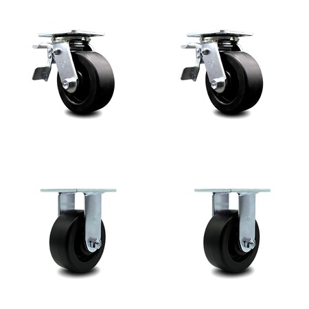 Polyolefin Swivel Caster w/Main. Free Bearings Set of 4 w/5" x 2" Black Wheels - Includes 2 Swivel with Total Lock Brakes & 2 Rigid - 2600 lbs Total Capacity - Service Caster Brand