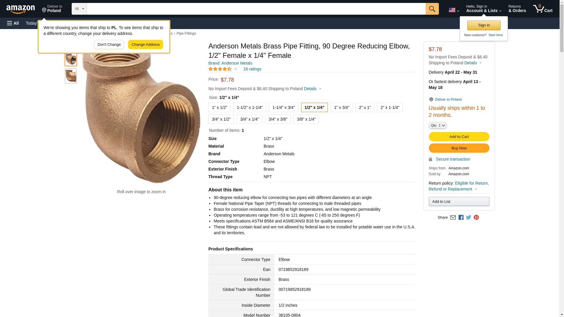 Anderson Metals Brass Pipe Fitting, 90 Degree Reducing Elbow, 1/2" Female x 1/4" Female