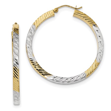<ul> <li>14k & Rhodium Polished & D/C Square Tube Hoop Earrings</li> <li>14k Tri-Color</li> <li>Length: 42.09mm; Width: 39.9mm; Approximate Weight: 4grams</li> <li>Gift Box Included.</li> </ul>
