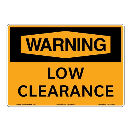<p><strong>Word Message: </strong><br />LOW CLEARANCE</p> <p><strong>Description: </strong><br />Clarion Safety Systems brings you Warning Low Clearance safety signs (OS1147WH-) which are produced on premium plastic or aluminum material and are designed to meet your OSHA safety sign needs.<p><strong>Material Information:</strong></p> <ul> <li><strong>Material</strong>: (S4) Outdoor Weather Tuff Aluminum</li> <li><strong>Base Materials</strong>: .040" Rigid White Aluminum</li> <li><strong>Overlaminate</strong>: 3M .003 Ultra-Clear WeatherTuff UV resistant</li> <li><strong>Mounting Option</strong>: Mounting holes</li> <li><strong>Application</strong>: Indoor/Outdoor</li> <li><strong>MaxTemp</strong> (F): 175</li> <li><strong>MinTemp</strong> (F): -40</li> <li><strong>Chemical Resistance</strong>: Excellent</li> <li><strong>UV Resistance</strong>: Excellent</li> <li><strong>Outdoor durability</strong>: Excellent</li> <li><strong>Storage Stability</strong>: Stable. Optimum storage conditions: 72 F @ 50% relative humidity</li> <li><strong>Expected Life Indoor</strong>: Long term</li> <li><strong>Expected Life Outdoor</strong>: 5 - 10 years (expected outdoor life may vary due to climatic conditions)</li> <li><strong>RoHS</strong>: No</li> <li><strong>CRoHS</strong>: No</li> <li><strong>REACH</strong>: No</li> </ul>