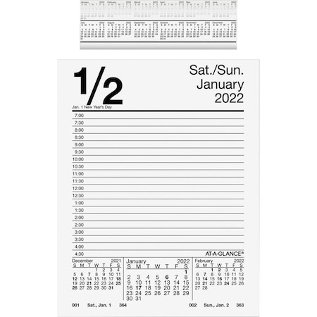 12 months (Jan.-Dec.), Julian dates. Full-year calendar reference under magnifying lens at top of each page. Half-hourly appointments, 7:00 a.m. to 4:30 p.m.; one weekday per page. AAGE5800: Pad-Style Desk Calendar Base (sold separately). Holds standard pad-style (5" x 8" page size) calendar pages (E458). Plastic feet protect desk surface. Molded plastic. Magnifying window at top shows 12 reference calendar blocks.