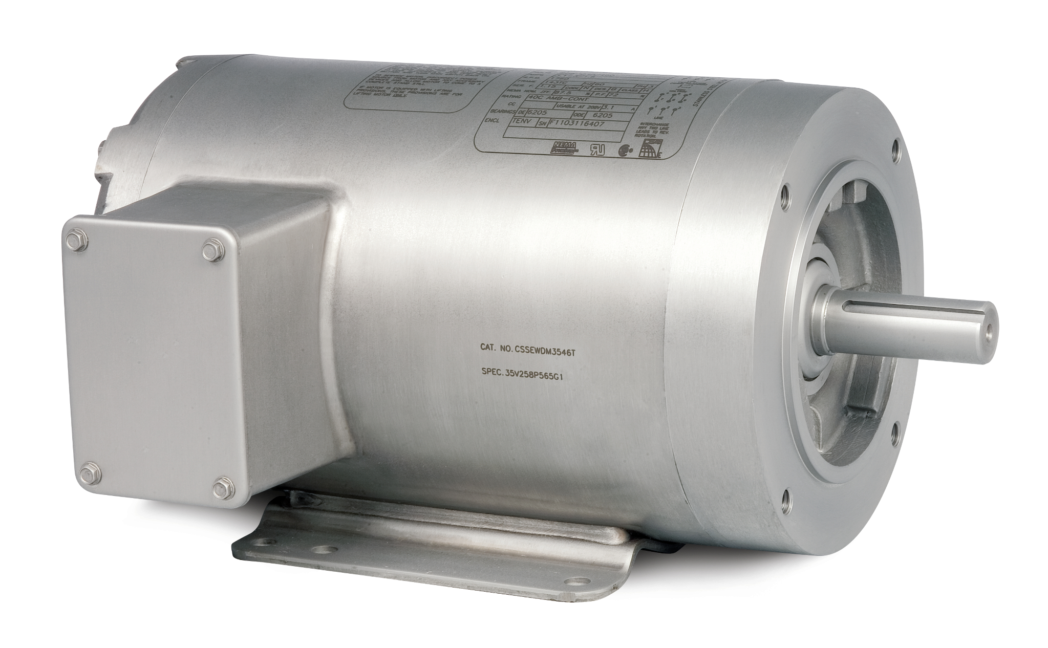 Baldor Electric, CSSEWDM3546T, 1HP, 1760RPM, 3PH, 460V;230V;208V, 143TC Frame, C-Face Flange, Foot Mount, TENV, Stainless Steel Washdown Motor