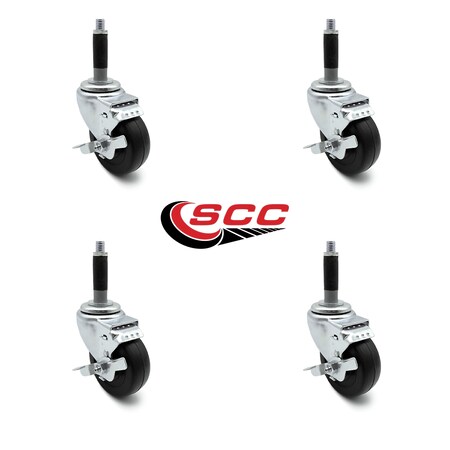 Hard Rubber Swivel Expanding Stem Caster Set of 4 w/3" x 1.25" Black Wheels and 3/4" Stems - Includes 4 with Top Lock Brakes - 1100 lbs Total Capacity - Service Caster Brand