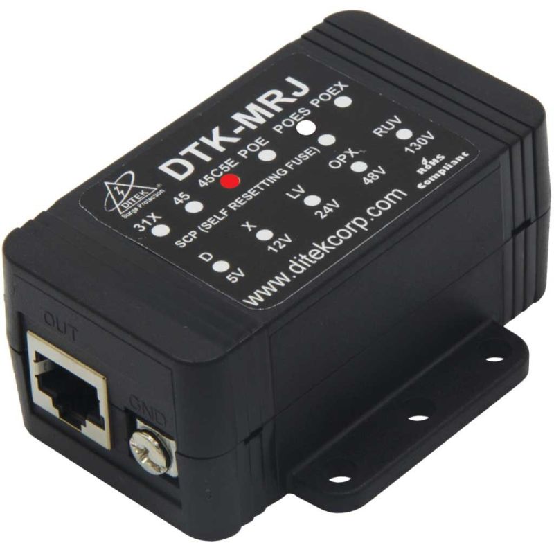 DITEK's Single channel DTK-MRJETHS provides IP surge protection for shielded CAT5e, CAT6 and CAT6A data lines to vital business equipment such as data networks, POS terminals and IP video cameras. This device is a sutiable replacement for the DTK-MRJ45C5E. � Protects all four shielded data pairs � Data speeds up to 10GbE without signal degradation � Uses SAD and GDT technologies for optimal circuit protection � Uses SAD and GDT technologies for optimal circuit protection � Data speeds up to 10GbE without signal degradation � Protects all four pairs � Shielded RJ45 connections with external grounding screw � Conforms to EIA/TIA standards for data transmission � Automatically resets to protect against multiple surges