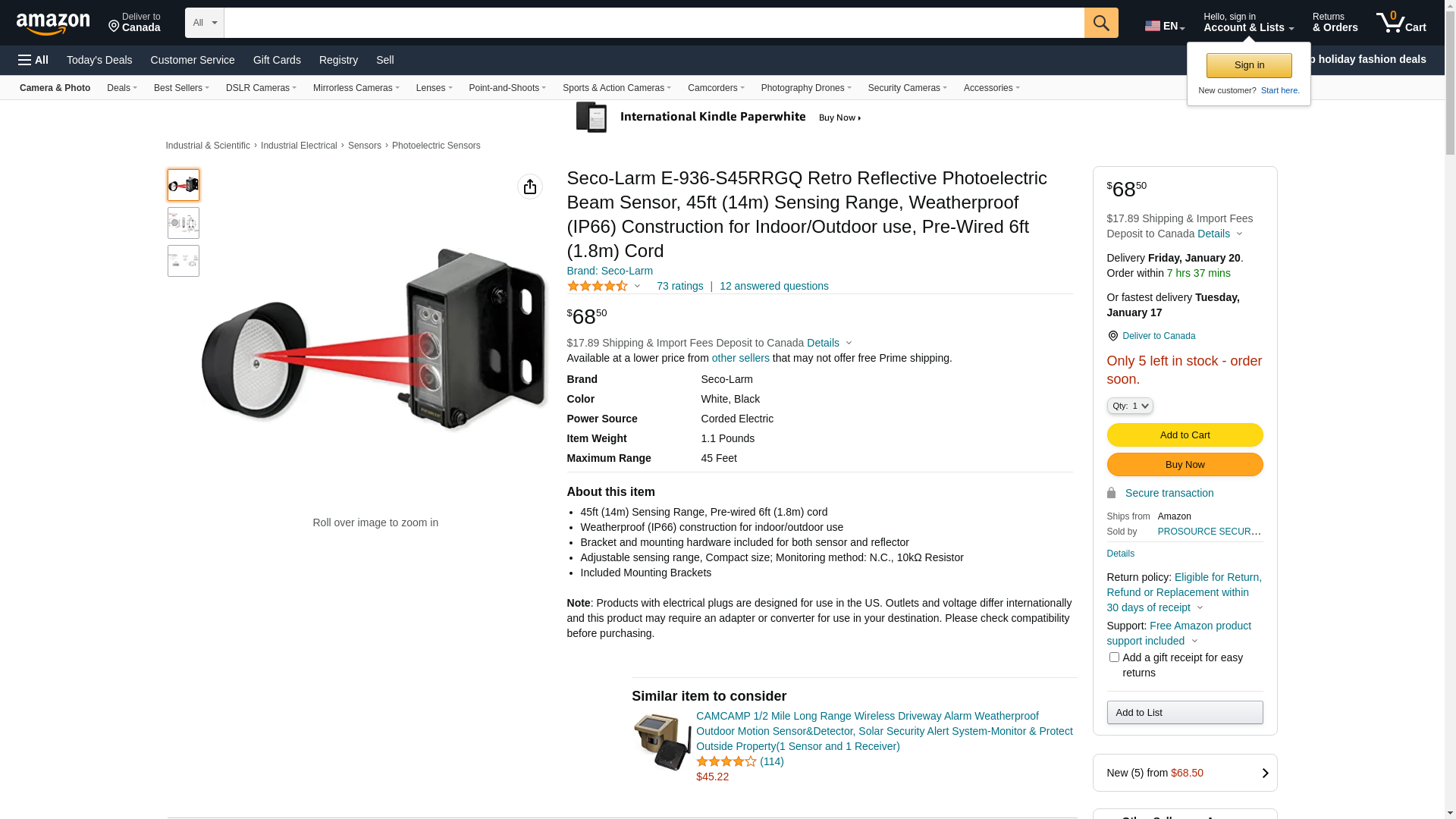| Feature | 45ft (14m) Sensing Range, Pre-wired 6ft (1.8m) cord |