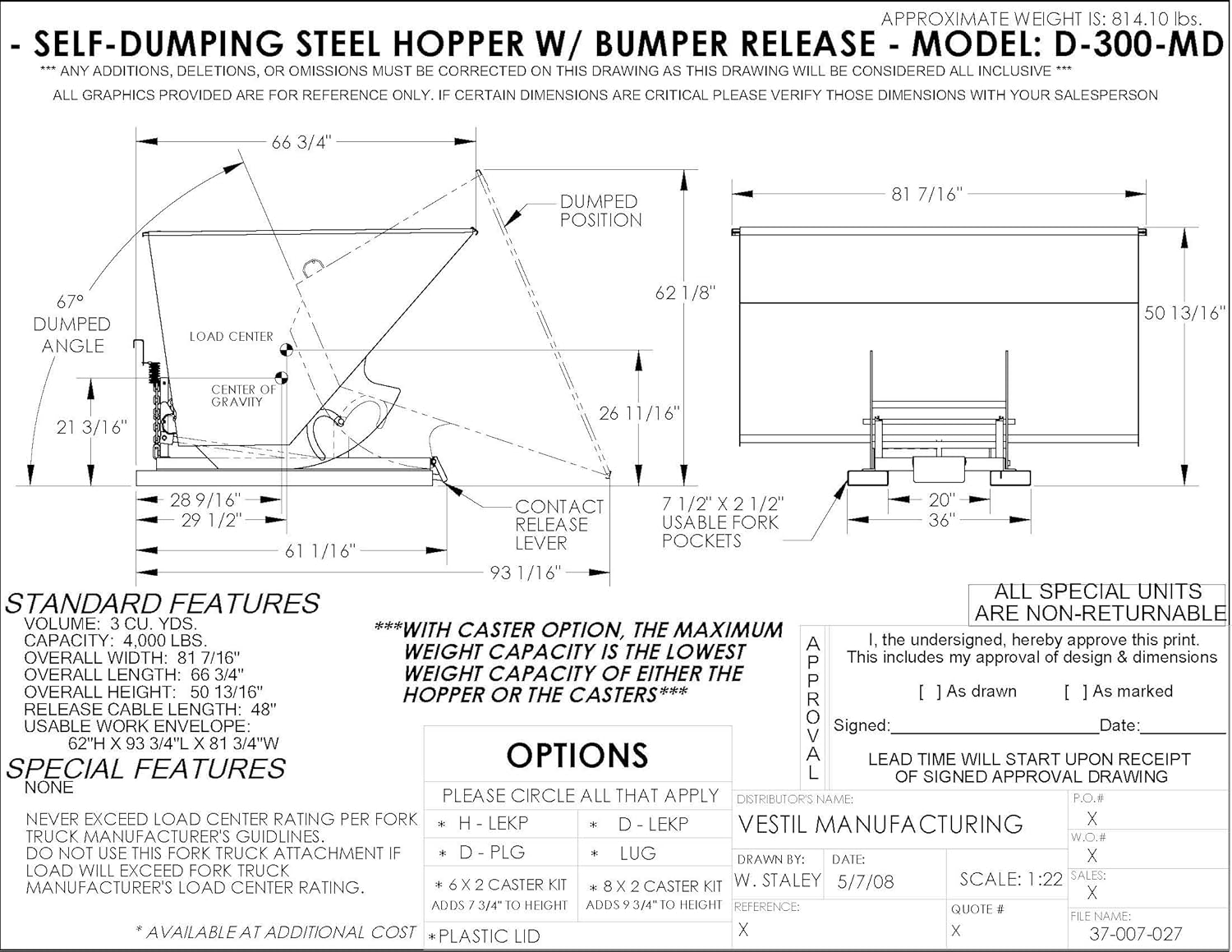 This Medium Duty Self-Dumping Steel Hopper with Bumper Release automatically dumps when bumper release contacts the side of the dumpster. Hopper returns to an upright and locked position automatically after it dumps. Also includes a cable that may be operated from the seat of the fork truck to manually dump the hopper. The included safety restraint should be properly secured to a fork truck before dumping. (Length Dimension is measured at top of chute.).