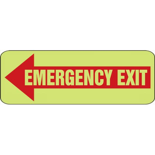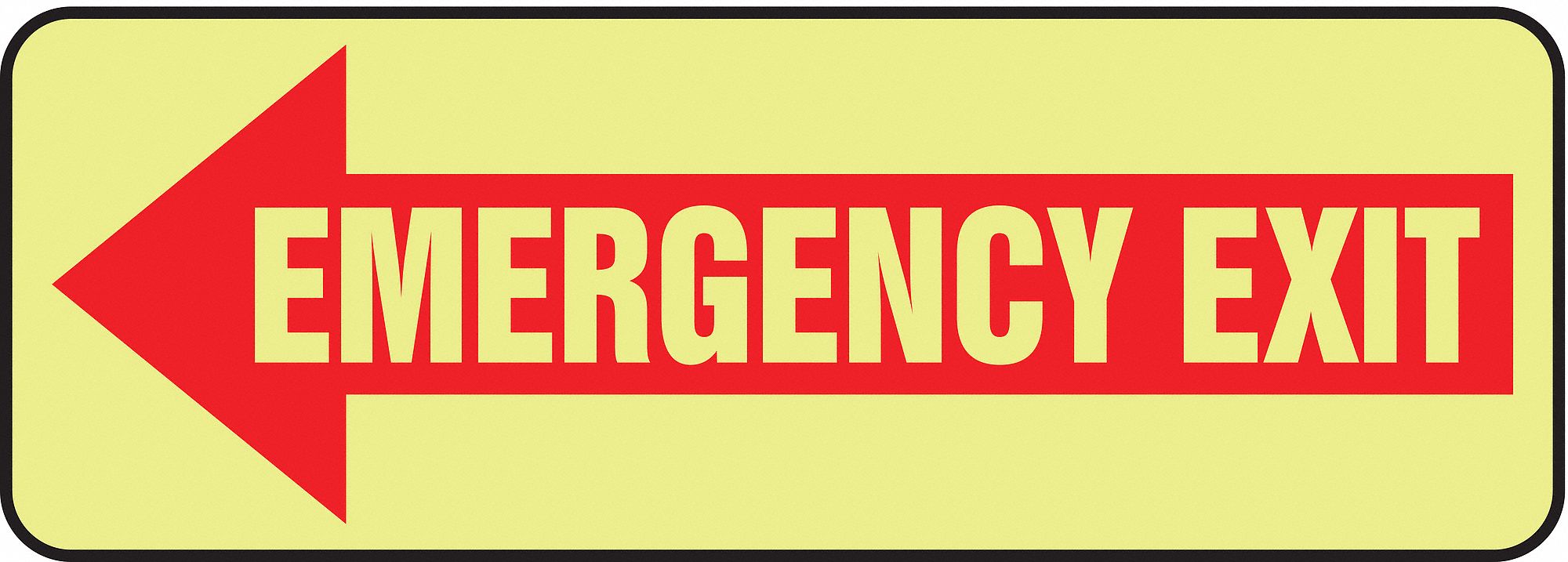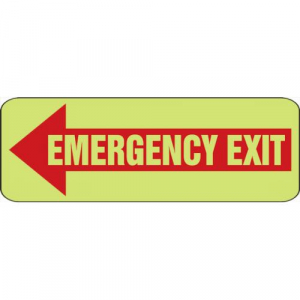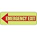 - Price For: Each Language: English Subject Matter: Exit & Evacuation Legend Style: Text and Symbol Mounting Style: Surface Legend/Background Color: Glow Yellow/Red on Glow Yellow Legend: Emergency Exit (w/Left Pointing Arrow) Width: 10" Material: Lumi-Glow Flex Item: Emergency Exit Sign Height: 3-1/2" Country of Origin (subject to change): United States